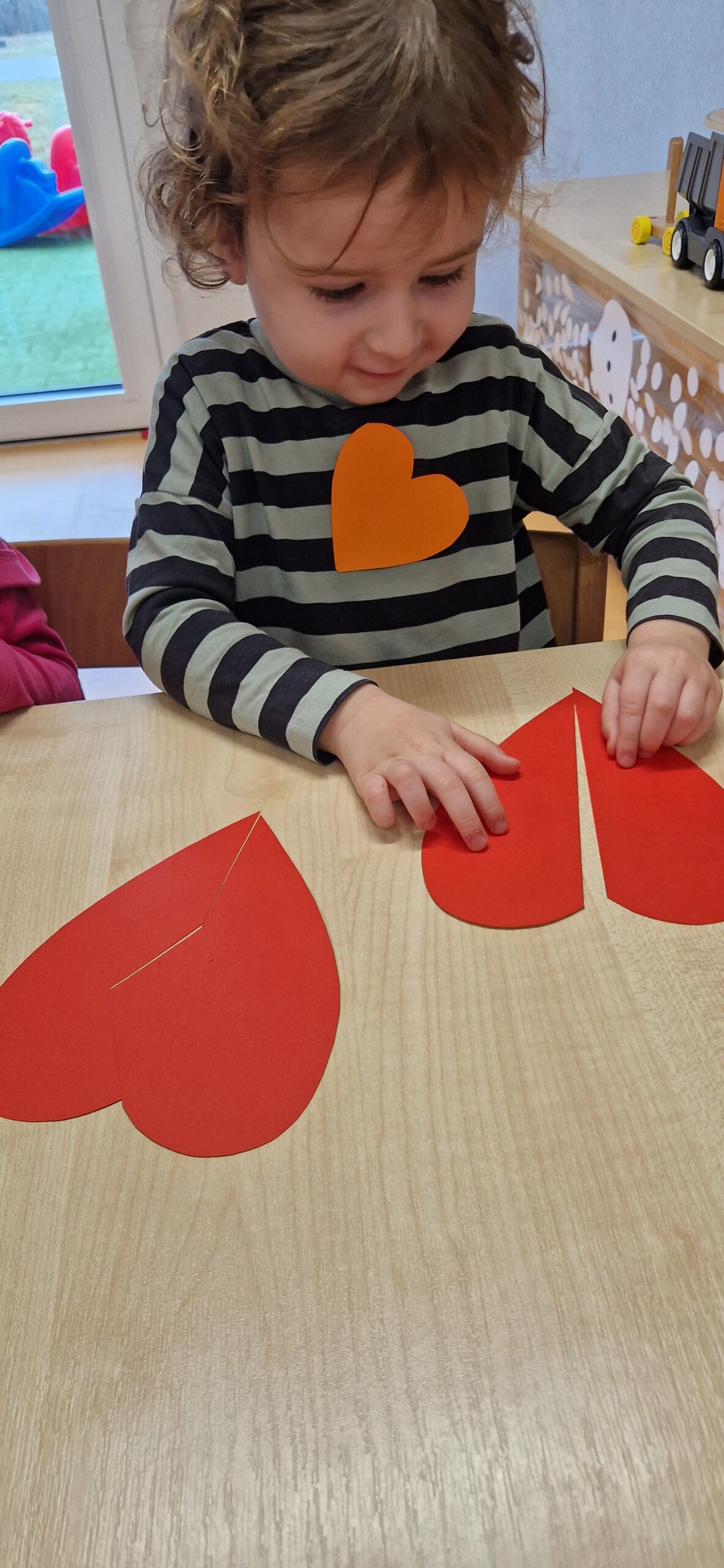 Chłopiec siedzi przy stole i łączy w pary papierowe czerwone serduszka.