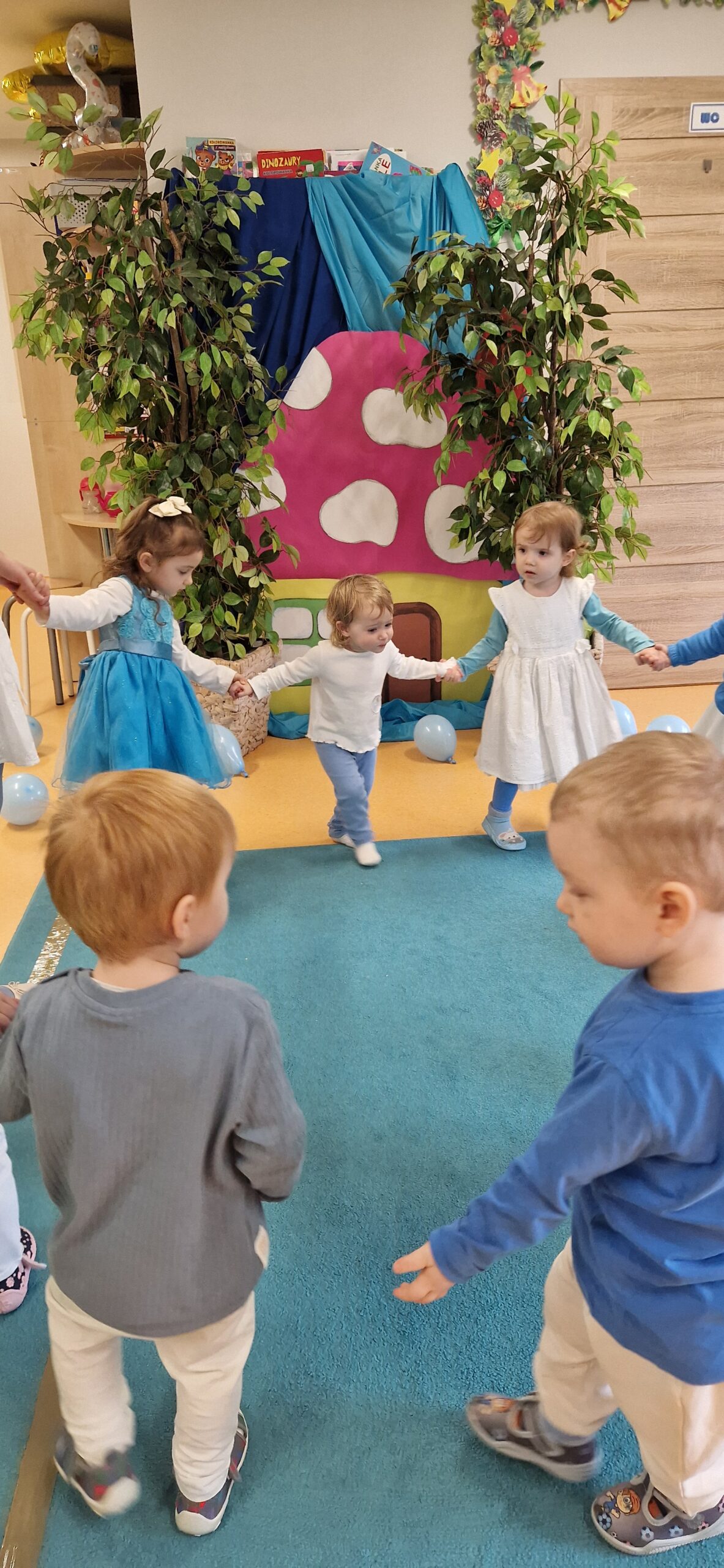 Dzieci ubrane na kolor niebieski trzymają się za ręce i tańczą w kole. W tyle widać wioskę smerfów.