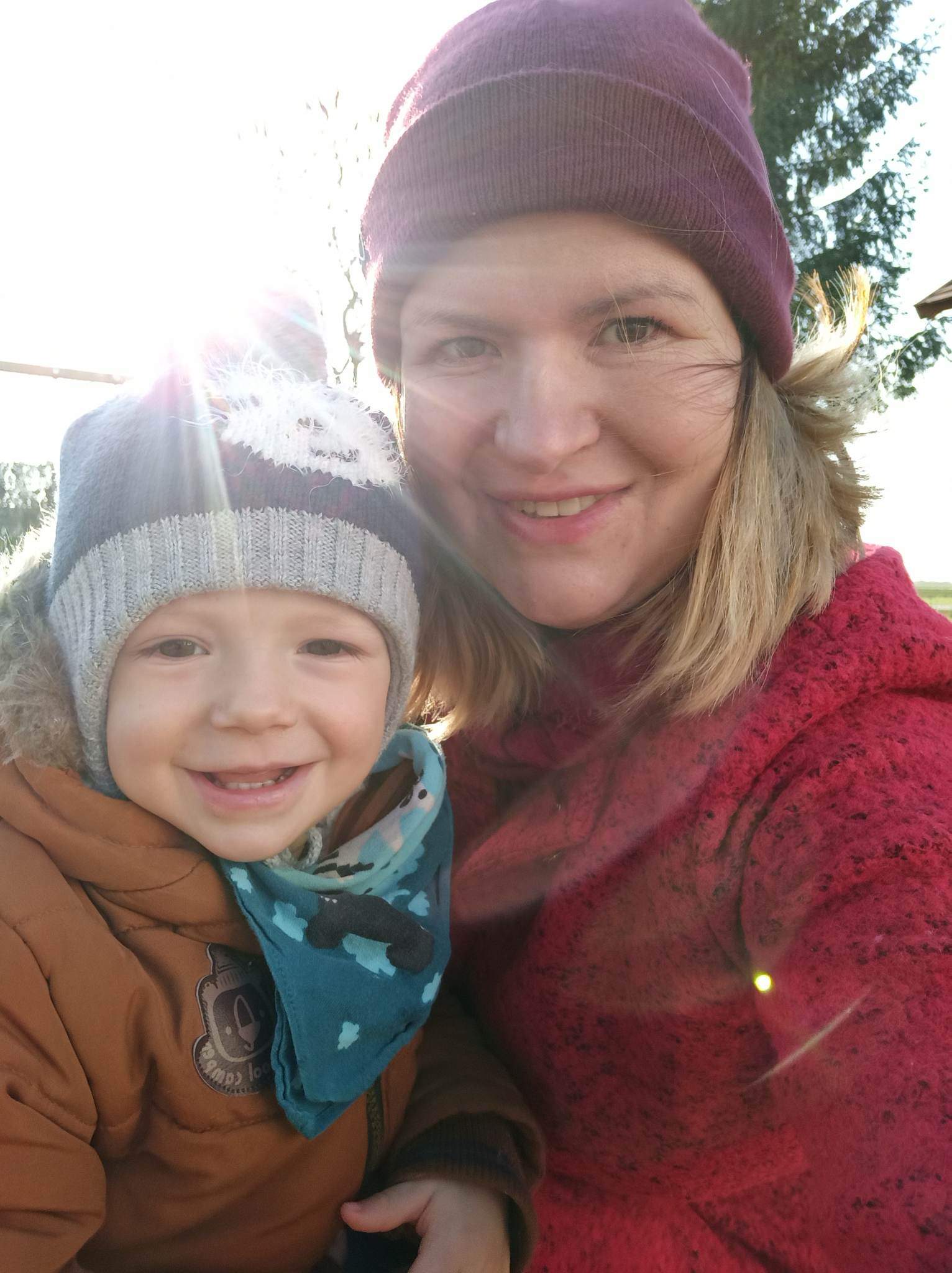 Kobieta z dzieckiem uśmiechają się pozując do zdjęcia ubrani w zimową garderobę.