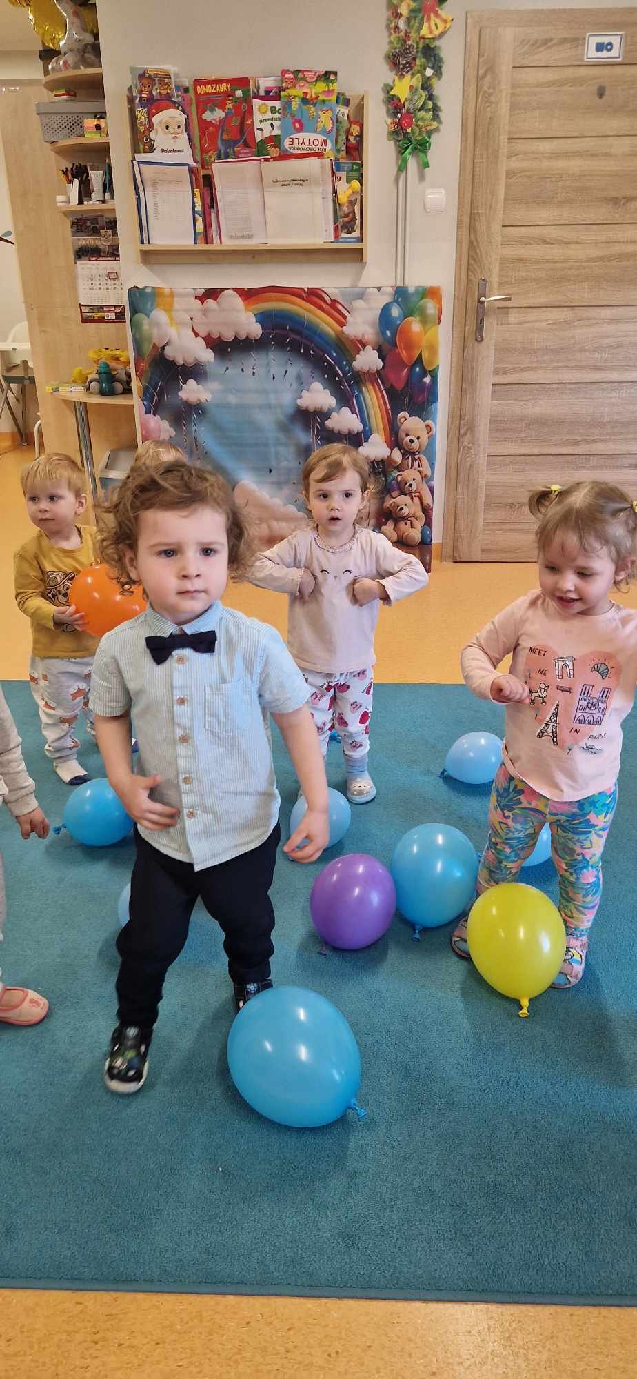 Chłopiec wraz z koleżankami tańczy na turkusowym dywanie. W tle widać urodzinową dekorację.