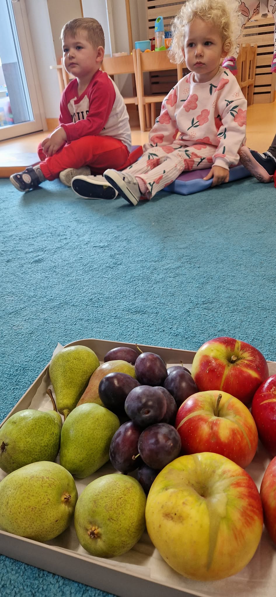 Dzieci siedzą na podusiach i oglądają owoce z sadu.